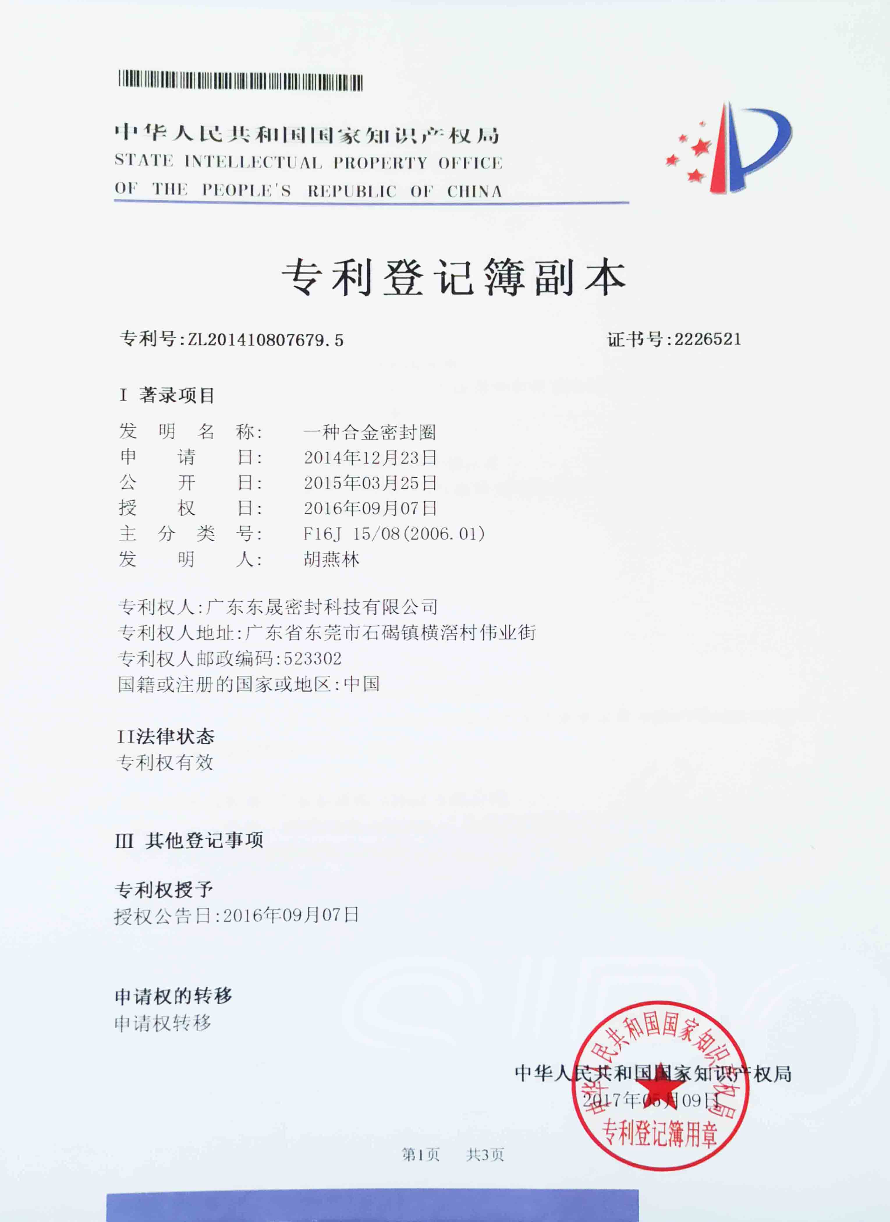 • 一種合金密封圈的專利證書